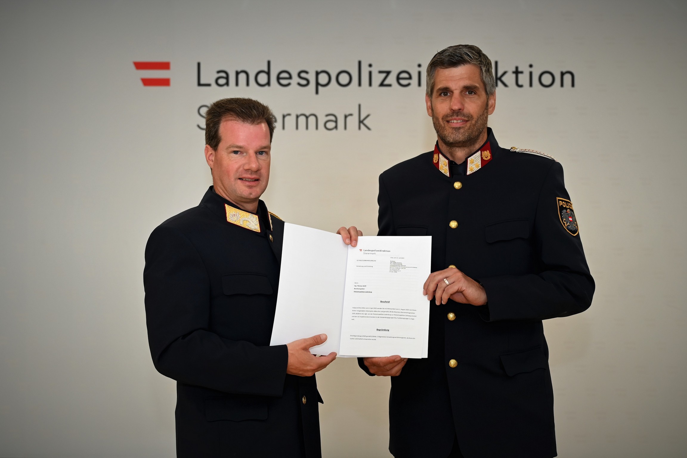 ©LPD-Stm-Hellinger, Landespolizeidirektor HR Gerald Ortner und Kontrollinspektor Ing. Thomas Auer der Polizeiinspektion Zeltweg
