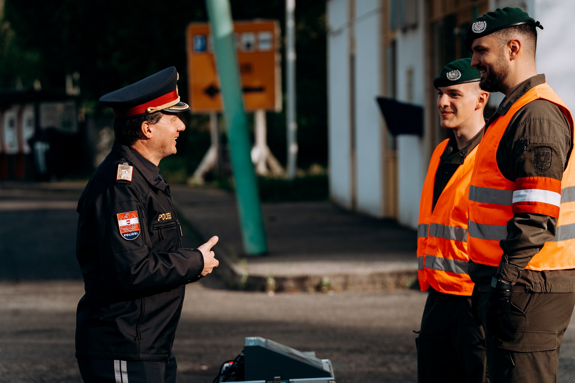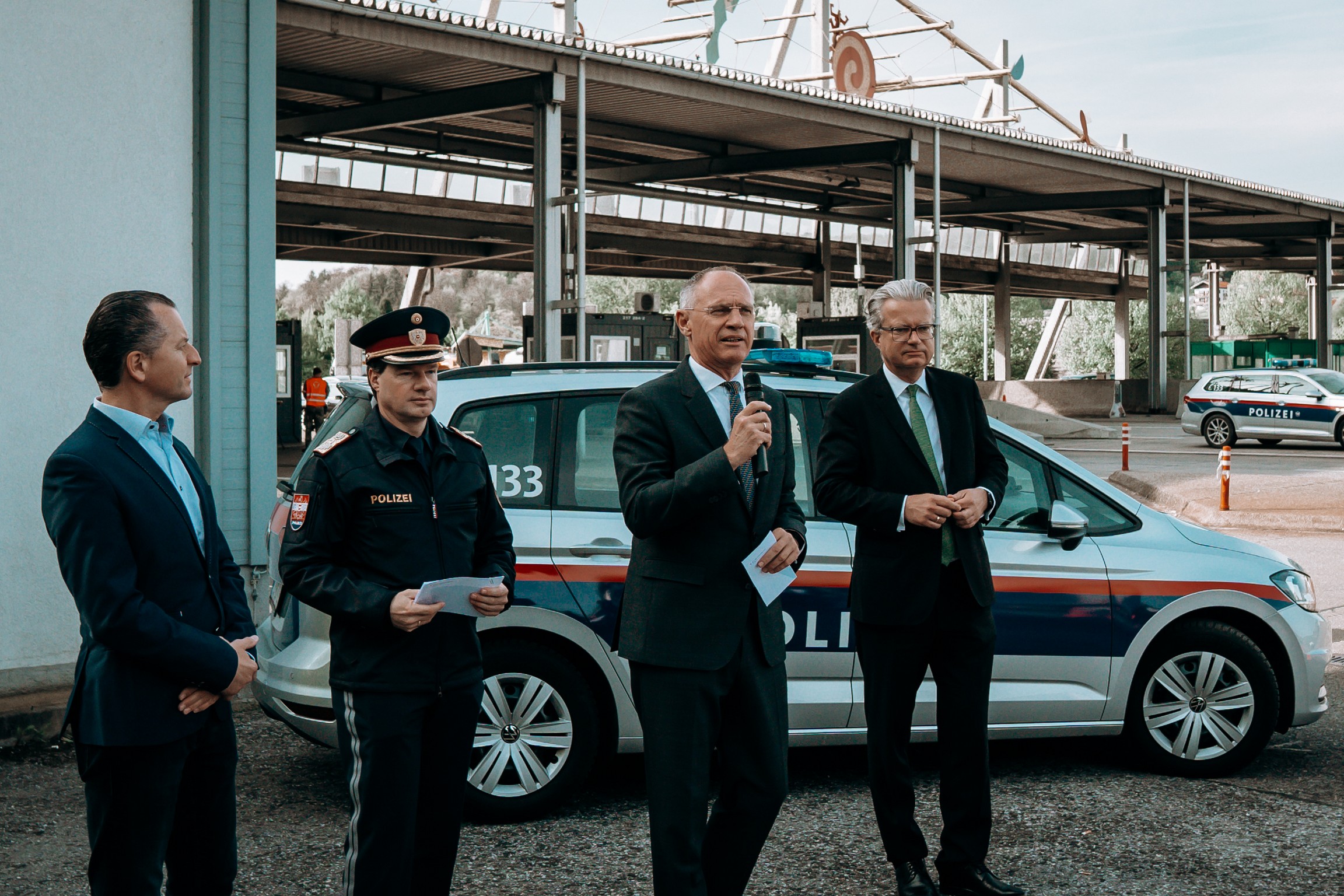 Bereits um 9.00 Uhr besuchten Innenminister Karner und Landeshauptmann Drexler gemeinsam mit Landespolizeidirektor Gerald Ortner den Grenzübergang in Spielfeld. Gespräche mit Polizistinnen und Polizisten der Fremdenpolizei und der Austausch zu aktuellen Herausforderungen im Bereich der Migration standen dabei im Vordergrund. Zudem verschafften sich die politischen Vertreter im Rahmen persönlicher Gespräche auch einen Eindruck von der Praxistauglichkeit neuer technischer Equipments. So wurde beispielsweise der bereits im Einsatz befindliche „Herzschlagdetektor“ zur Erkennung von illegal einreisenden Migranten in LKWs oder etwa neue Passlesegeräte vorgestellt.
