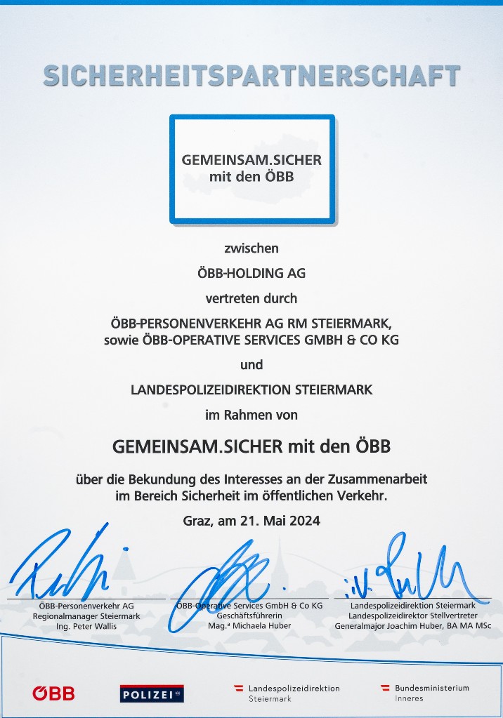 Durch die verstärkte Kooperation mit der Landespolizeidirektion Steiermark setzen wir Maßnahmen zur weiteren Erhöhung des Sicherheitsniveaus entlang der Reisekette. Die Sicherheitskampagne ‚GEMEINSAM.SICHER‘ unterstreicht unser Bekenntnis zu einer sorgenfreien und sicheren Reise für unsere Fahrgäste und zum Schutz unserer Mitarbeiter:innen.“