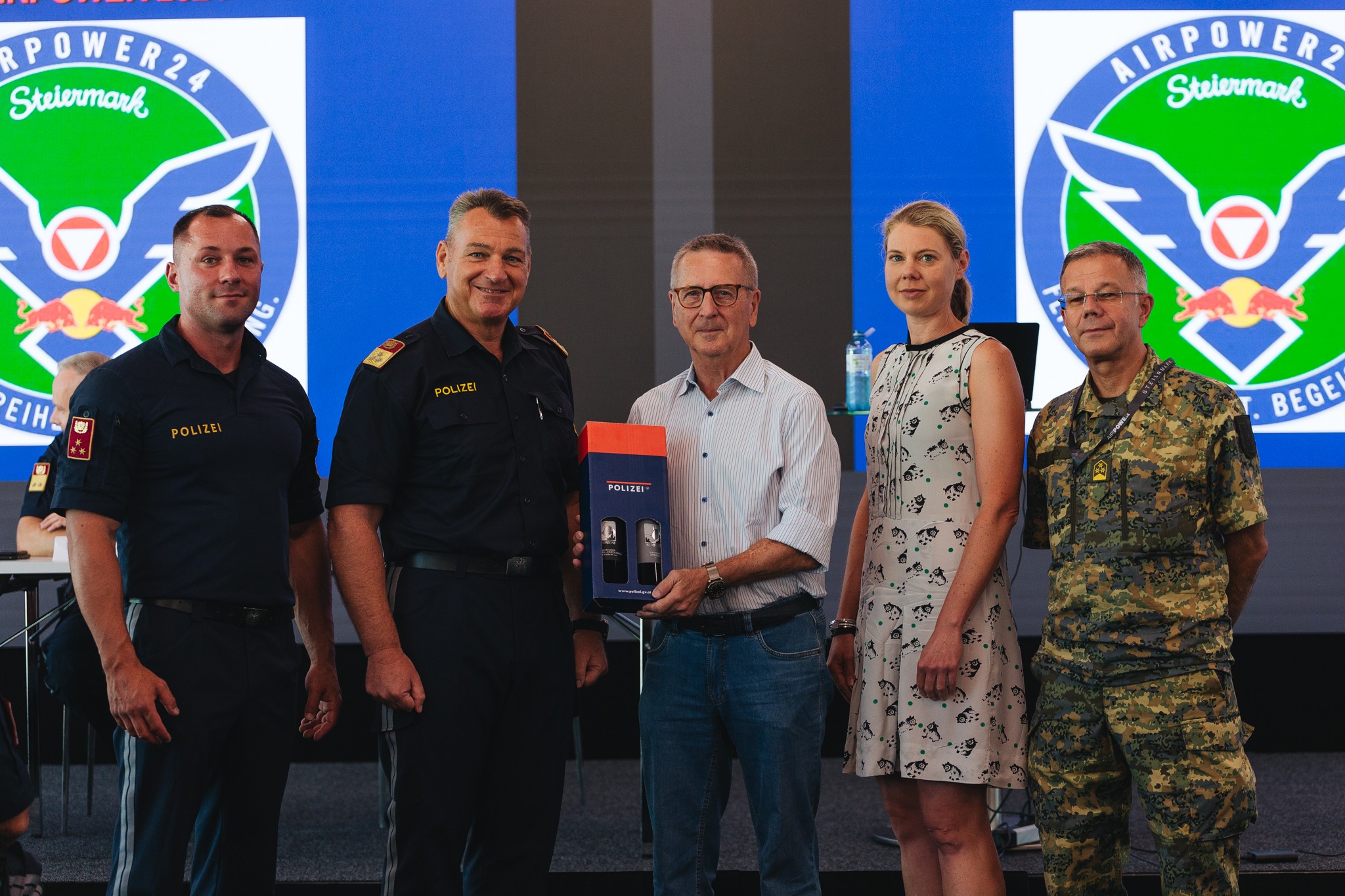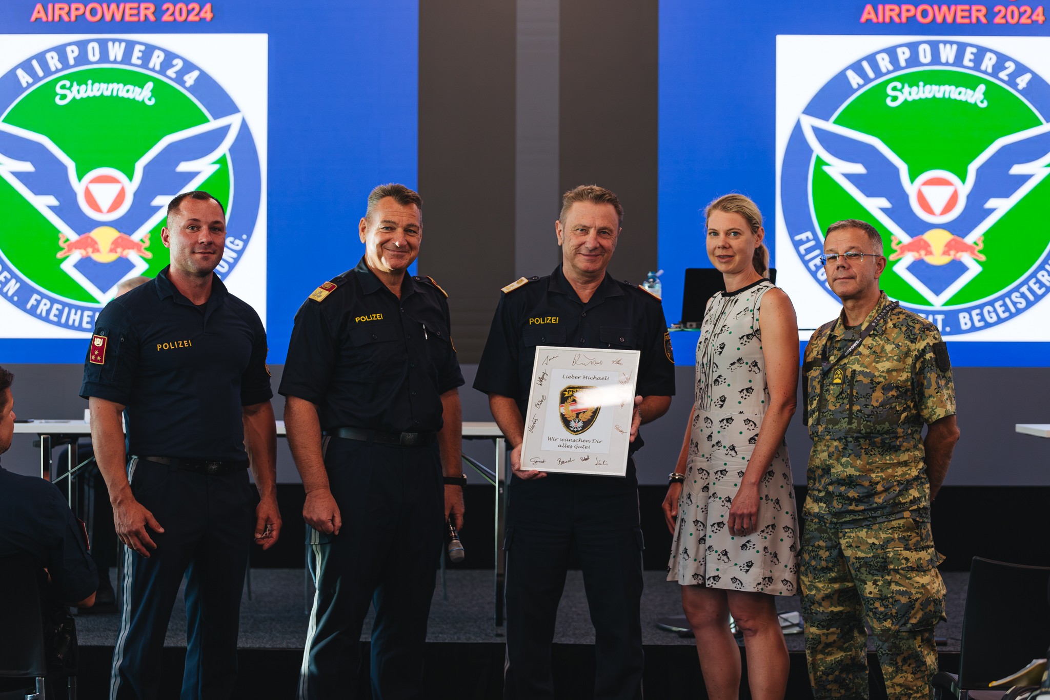 Den würdigen Rahmen für die Einsatzbesprechung im Mediacenter des Red Bull Rings nutzte Obst Kurt Lassnig auch um Danke zu sagen. So verabschiedete er Chefinspektor Michael Jilk der Landesverkehrsabteilung (LVA) Steiermark nach über 40 Einsätzen bei Sportgroßevents im Murtal in den wohlverdienten Ruhestand. Mit seinem Fachwissen und seiner Erfahrung war er über vier Jahrzehnte lang in die Einsatzplanung bei derartigen Events involviert – die AIRPOWER24 wird sein letzter Großeinsatz sein. Auch der Hausherr und Red Bull Ring-CEO Erich Wolf wurde anlässlich seines bevorstehenden Ruhestandes gewürdigt. Dabei wurde dem früheren Militärpiloten und Berufsoffizier vor allem für die langjährige und hervorragende Zusammenarbeit mit der Exekutive bei Großevents gedankt. Auch die Murtaler Bezirkshauptfrau Dr.in Nina Pölzl und der polizeiliche Gesamteinsatzleiter Hauptmann Andreas Tafeit (Bezirkspolizeikommando Murtal) waren unter den Gratulanten. Bei ihren Reden zur Begrüßung der vielen Einsatzkräfte aus allen Teilen der Steiermark wurde auch eines mehrmals betont: Die Bedeutung der Zusammenarbeit von Behörde, diversen Organisationen und dem Veranstalter. Schließlich sei es gelebte Kooperation aller Beteiligten, die den Gesamterfolg eines derartigen Großevents ausmacht.