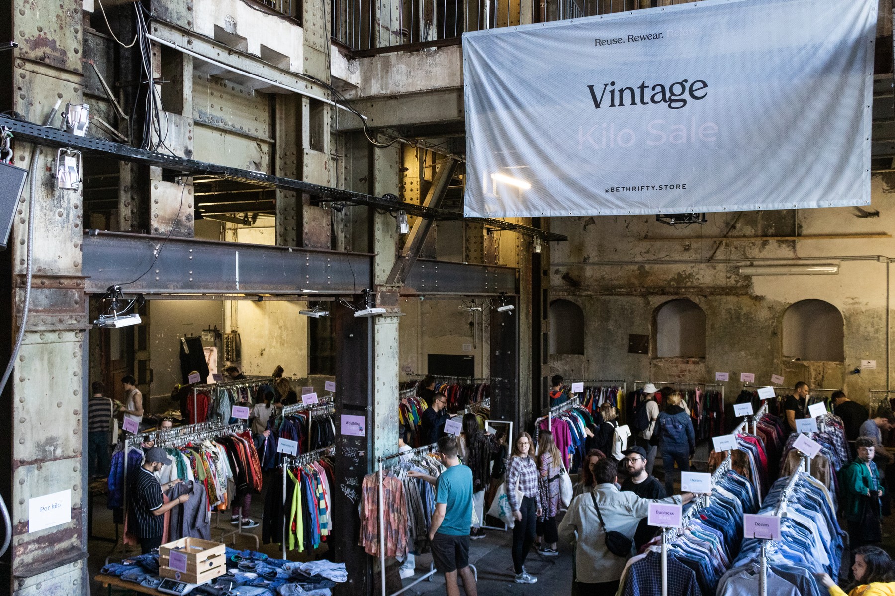 Umweltbewusstsein, Sparsamkeit, Individualität und eine große Auswahl an einzigartiger und wieder angesagter Mode und Accessoires sind die Eckpfeiler des bekannten und coolen Second-Hand-Konzepts von BeThrifty Vintage Kilo Sale. Die umweltfreundliche Alternative hebt sich von herkömmlichen Gewohnheiten der Modeindustrie ab. Herstellung und Lieferkette beginnen mit Einzelstücken aus diversen Altkleidersammlungen, verteilt in ganz Europa. In anerkannten Recyclinglagern wird bewusst sortiert. Danach wird ausschließlich Vintage-Ware in High-Quality-Standards an BeThrifty geliefert. Diese Ware wird erneut von den BeThrifty-Mitarbeiterinnen und -Mitarbeitern sortiert, überprüft und – falls notwendig – ausgebessert, bevor die Exemplare für die Verkauf-Events aufbereitet werden. Tatsächlich einzigartig ist das konkrete Verkaufsangebot – und vor allem bei Jungen und Junggebliebenen sehr beliebt: Unterschiedliche Kleidung mit individuell ausgesuchten und kombinierten Einzelstücken zu einem Kilopreis von 45 Euro. Und das in einer Vielzahl von Größen und Lieblingsbrands wie Nike, Adidas, Reebok, Lacoste, Ralph Lauren und noch viele mehr. Eine Auswahl von 60 verschiedenen Kategorien (Windbreaker, Lederjacken, Sweater und Hoodies, Crazyprint-Hemden etc.) mit Größen von XS bis XXL warten auf Fashion-Begeisterte. Bar- und Kartenzahlung sind möglich, selbstverständlich gibt es Umkleidekabinen.